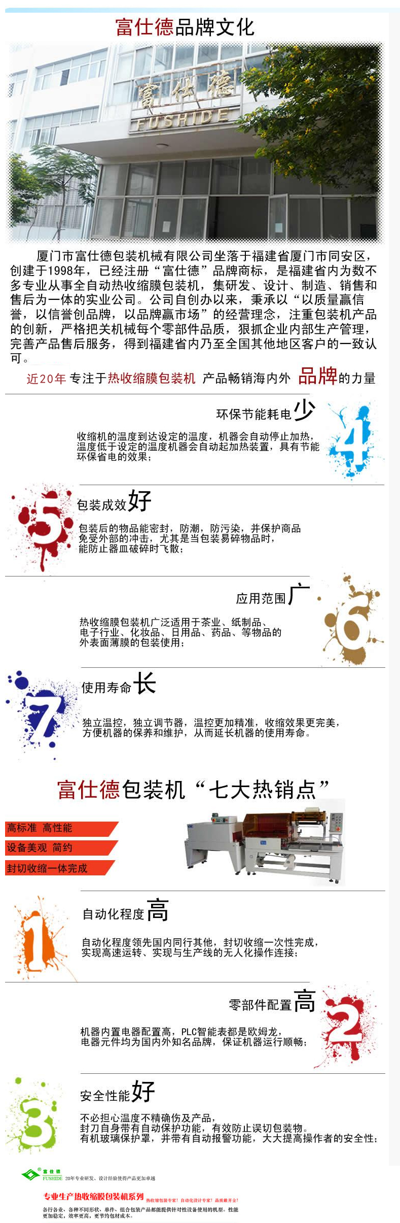 富仕德包裝,專業(yè)生產(chǎn)包裝行業(yè)的各類包裝設(shè)備,旗下產(chǎn)品有專利科技的全自動熱收縮膜包裝機(jī)、熱收縮機(jī)、纏繞機(jī),開箱機(jī),封箱機(jī),裝箱機(jī),打包機(jī),碼垛機(jī)、封切收縮機(jī)等十幾個(gè)品種一百多種產(chǎn)品。富仕德的產(chǎn)品不僅可以單機(jī)使用還可以整合穿插使用。