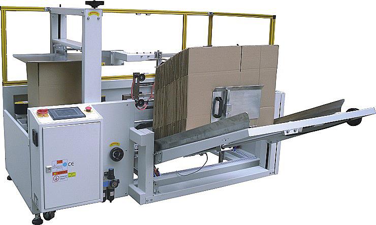 開箱機(jī)也叫紙箱成型機(jī),箱子底部按一定程序折合,并用膠帶密封后輸送給裝箱機(jī)的專用設(shè)備。自動紙箱成型機(jī)、自動開箱機(jī)是大批量紙箱自動開箱、自動折合下蓋、自動密封下底膠帶的流水線設(shè)備,機(jī)器全部采用PLC+顯示屏控制,大大方便操作,是自動化規(guī)模生產(chǎn)必不可少的設(shè)備。